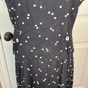 This stunning black and white polka dot dress is perfect for any occasion and short sleeves give it a professional look, while the fit & flare style adds a touch of fun. The dress is made of a polyester blend, making it machine washable and easy to care for. The midi length and layered accents with a zipper add a vintage touch to the dress.Measurements: Armpit to Armpit 19” Length 49” Good Pre-Owned Condition.