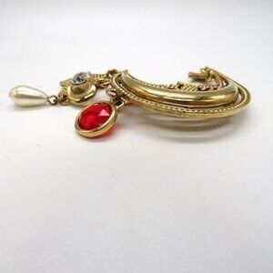 This unique Delizza & Elster Juliana brooch combines celestial elements with vintage charm. The gold-tone finish is complemented by a striking red crystal and elegant faux pearl, making it a distinguished accessory.