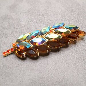 Step into vintage glamour with this authentic Juliana layered leaf brooch, designed in a rich autumn palette. Faceted dark topaz and vibrant orange rhinestones sparkle alongside shimmering aurora borealis accents, all expertly prong-set in a dimensional leaf design. The layered construction adds depth and elegance, making it a standout accessory for fall and beyond.