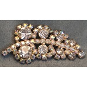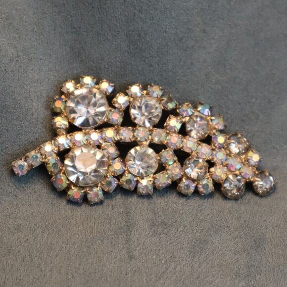 Beautiful large Juliana style vintage brooch with large clear rhinestones in the center surrounded by aurora borealis iridescent rhinestones. Pretty stones with pink, blue and purple fire, in a pretty stylized leaf or floral spray shape. Goldtone metal, unmarked but nice quality. 2 3/4" x 1 3/4", in great vintage condition