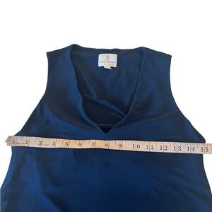 By Julie Brown, and navy neckline shift dress with an a line silhouette. Bodice has extra layer of lining . A Simple Minimalist everyday dress easily can be dressed up or more casual with sandals and statement jewelry. 92% Polyester 8% Spandex Great Stretch P is Petite based on measurements listed SP