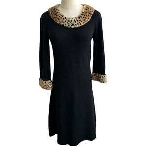 Julie Brown NYC Black Cheetah Faux Fur Trim Maggie Dress Size Medium in very nice used condition. This dress is so cute! It has pullover styling with a faux fur cheetah 🐆 print on the collar and on the 3/4 length sleeve cuffs. It has one button on the back with a keyhole opening. It has some stretch. Super cute with boots! Measurements are approximately 16” inches underarm to underarm and from shoulder to hem approximately 36” inches!