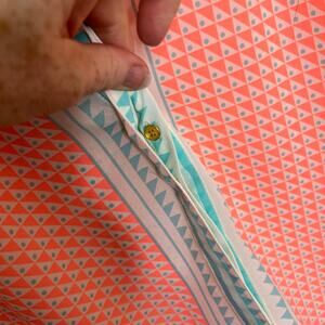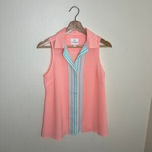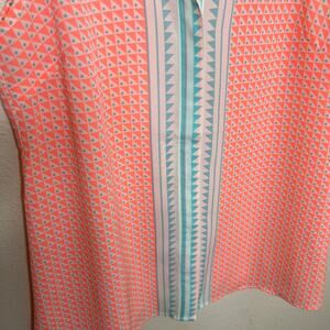 Julie Brown Orange Teal Geo Print Sleeveless Button Up 2. Preowned and in excellent condition. Sleeveless with orange/sherbet coloring, geo shapes, button up and light weight. Please see all photos. Approx measurements in pictures.