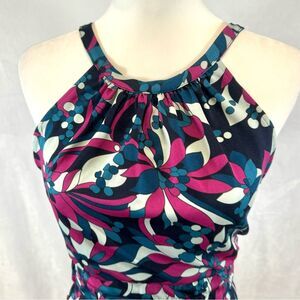 Julie Brown blue and pink abstract print banded waist halter dress size small