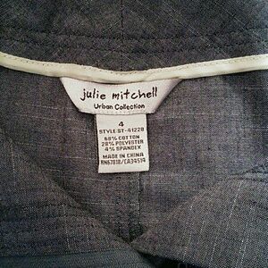 From the Julie Mitchell Urban Collection. Gray woven cotton blend fly front skirt with tie belt and decorative ivory contrast top stitching. Excellent condition. Flat waist measurement is approx 14". Length is approx 23". Size 4.