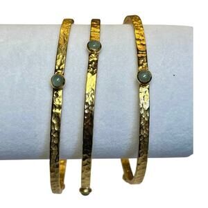 Beautiful set of three Julie Vos gold tone bangles featuring a lightly hammered finish and delicate bezel set light blue stones. Designed to be worn stacked together for an effortless layered look or mixed with other bracelets to build a custom wrist stack.