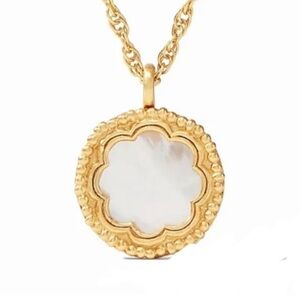 Julie Vos Trieste Mother of Pearl Coin Solitaire Necklace. New with tags. 24K gold overlay. Can be worn on either side of pendant. A delicate, adjustable curb chain is accented by a small, intricately embellished coin pendant, featuring a beaded border, fleur-de-lis, scallop motif, and unicorn—all inspired by the history of Italy’s internationally-influenced city of Trieste.
