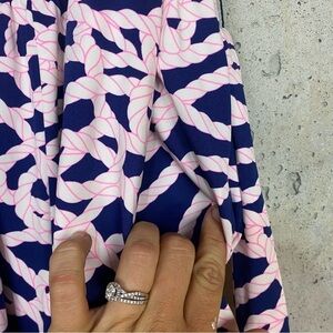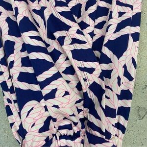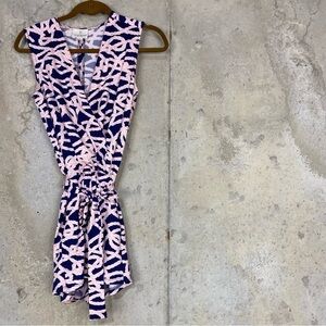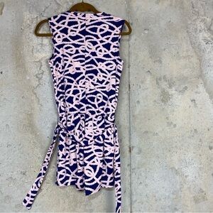 Julie brown navy sleeveless romper with pink and white nautical rope print. Has pockets!! Surplice, faux wrap v neck bust. Elastic waist with matching waist tie. Excellent preloved condition