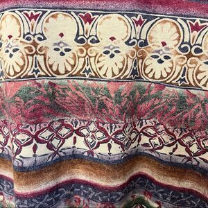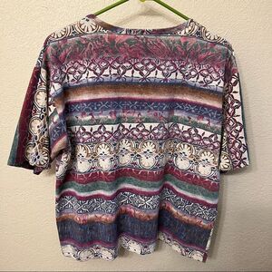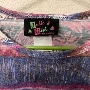 This multi color short sleeve tee is from Julie Girl. The item has graphic print. The top is made out of 50% cotton and 50% polyester. The size is medium. The measurements are 22” L x 20” W (pit to pit) x 9” sleeve (shoulder to cuff). This tee has been preowned but is in very good condition.