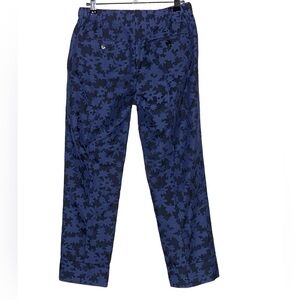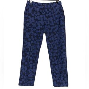 Upgrade your wardrobe with these stylish blue and black pants. Perfect for a casual day out or a relaxed evening. Experience comfort and style in one. Slight elastic waist. No size or care tag. See measurements. Fits a size 4. Waist straight across 14 inches. Rise 9 inches. Inseam 25 inches.