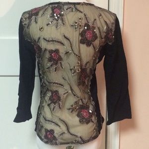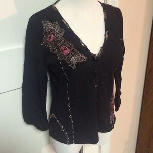100% rayon black sweater size small . Button front . Floral sequined embellishment . Mesh back with same embellishments . Great condition