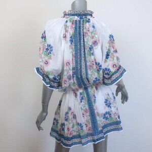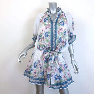 Juliet Dunn Blouson Tie-Waist Mini Dress White Rose Border Print Cotton Size 2