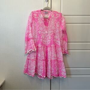 The Fuchsia Palladio Print Flared Sleeve Dress is made from a vibrant pink and bright white floral block print. This blouson mini is finished with ric rac trim to create a scalloped hem and sleeve detail. Excellent condition.