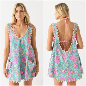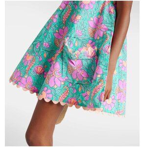 "An easy-fitting swim cover-up constructed from lightweight cotton with a colorful floral print and contrast scalloped edges.