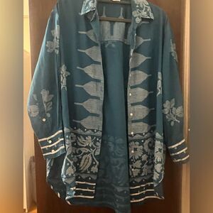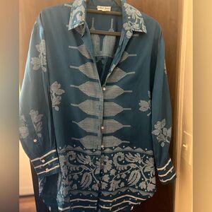 Juliet Dunn Petrol Dhaka Print Shirt ,luxury resort wear, size 0 (US 2-4)