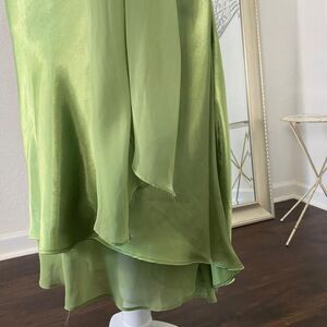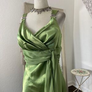 ༓ stunning green silky soft satin dress with micro mesh sash on waist
