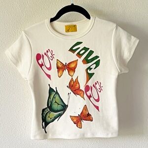 Juliet Johnstone JJ 1 of 1 Butterfly Love Print Y2K Baby Tee T-Shirt Size Small