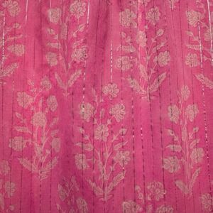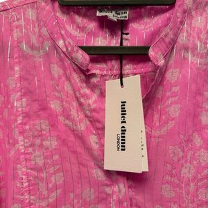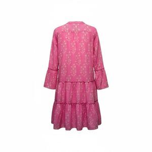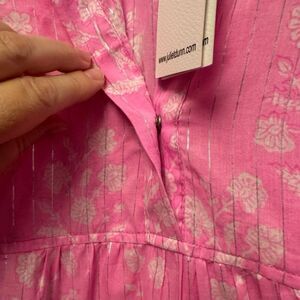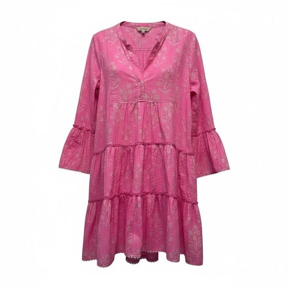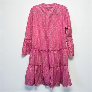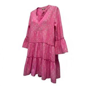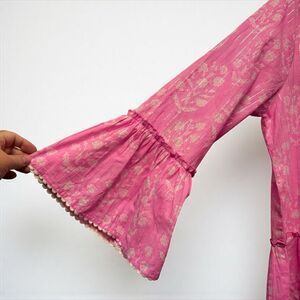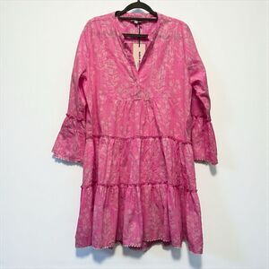This adorable dress is brand new with the tags attached. It is pink with a white floral pattern and silver thread stripes woven in. It has two tiers and rick rack lace finished on the hem and bell sleeves. Labeled Size 1.