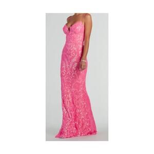 Julissa NEON PINK V-Neck Sequin Mesh Mermaid Dress Sz XS