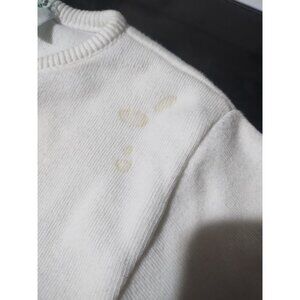 100% cotton, made in the USA, cute pearly buttons, crewneck, great quality, there are a few small stains that maybe someone that's more savvy with stain removal can remove (picture 4), super cute sweater, vintage look