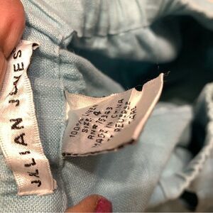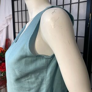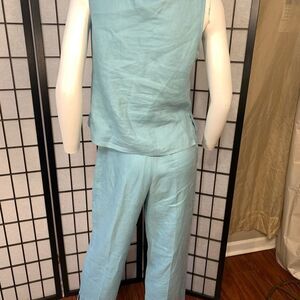 Set of 3 pieces; tank pit: 18 1/2” length: 25” with a button on back at the neck, V Neck and slits on hem. Button up shirt pit: 20” length: 25” 3/4 sleeves does not come with pin. Pants waist: 28” hips: 20 1/2” length: 27” with pockets and elastic waistband, Capri length with button and slits. The top and tank have no tags but the pants says Jillian Jones sz 4 used condition. Machine wash cold with light colors only, non chlorine bleach when needed, line dry, warm iron, dry clean only. 100% Linen