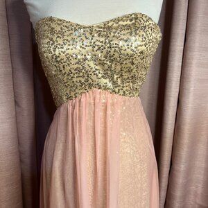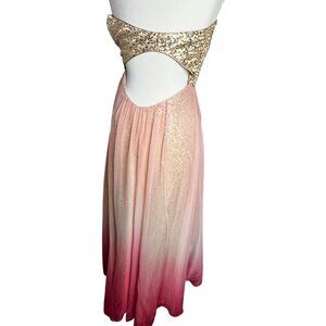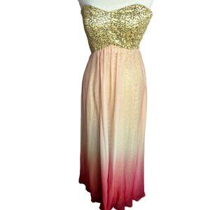 JUNIORS Jump Apparel 9/10 Formal Gold Sequin Pink Strapless Baby Doll Pink Ombre Maxi Dress Homecoming