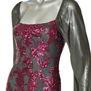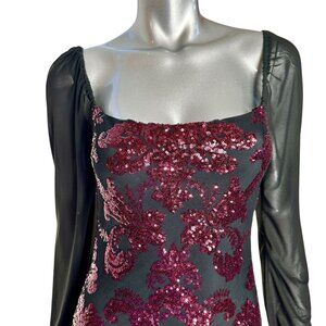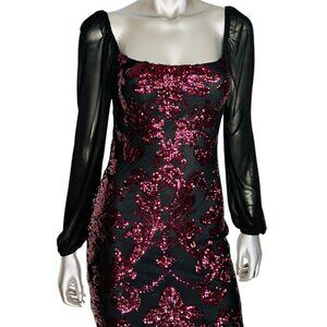 Elevate your evening look with this striking mini dress. The burgundy sequins shimmer beautifully, while the sheer sleeves add a touch of elegance.