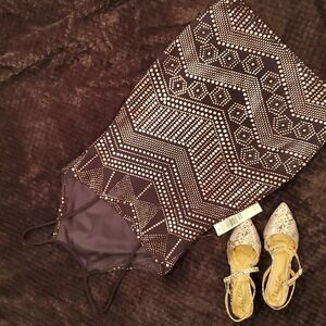Fun, Flirty, Funky! Jump Apparel Body Con Dress. Size 9/10. Grey Background with Metalic Pink Geometric Pattern. Great for a night out on the town. This pretty mini is a stunner.