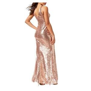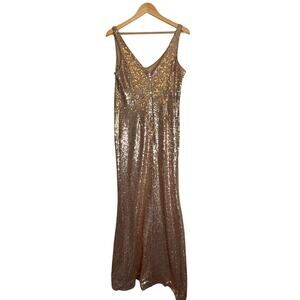 Sleeveless gold sequin floor-length dress. Juniors dress size 11/12, womens dress size 10/12 - see measurements. V neck. Fully lined. Back zipper and hook and eye closure. PLEASE READ – bottom hem appears altered with 1 inch of hem tape, see pics, if plan on altering 1 inch or more, will be nonissue. Other than hem, excellent preowned condition EUC. Professional, highly rated seller, quick shipper, open to offers!