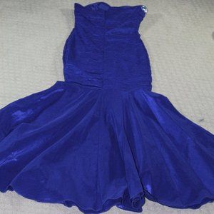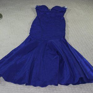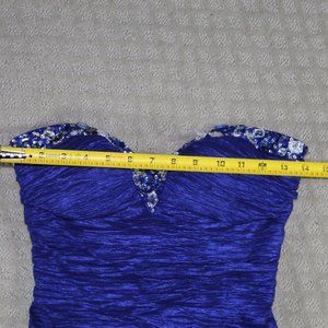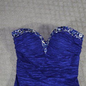 This strapless formal dress shape flattering, mermaid style ruched body with jeweled neckline. Eye-catching vibrant blue with a style to match. Be the Belle of the ball/prom. Excellent pre-owned condition.