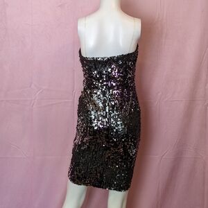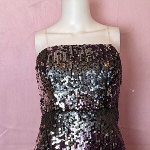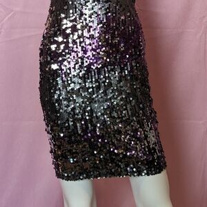 This statement-making Jump Apparel bodycon mini dress is perfect for your next special occasion! This gorgeous piece features silver and purple sequins with clear straps for an eye-catching look, perfect for a night of dancing.
