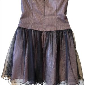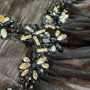 CLASSY AND CHIC DRESS BY JUMP. THIS DRESS IS TRULY STUNNING IN PERSON! PERFECT FOR PROM, HOMECOMING, PARTIES, HOLIDAYS OR ANY SPECIAL OCCASION. DESIGNER DETAILS INCLUDE: BEAUTIFUL BLACK TULLE WITH GLITTER ACCENTS; SWEETHEART NECKLINE; STRAPLESS GATHERED ON TOP~ ACCENTED WITH BLACK AND CRYSTAL RHINESTONES; ZIPPER CLOSE; ABOVE-KNEE LENGTH; FULLY LINED; 100% POLYESTER.