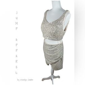 👉🏻 Allover sequins lend contemporary glamour to a two-piece dress featuring a sleeveless crop top and a sultry miniskirt with an alluring notched hemline.