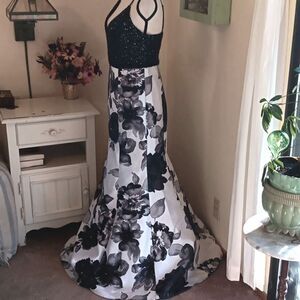 Stunning design. The bodice is a stretchy knit covered with black sequins. Built-in bra. Adjustable straps. The full skirt is a dramatic floral in a satiny twill. Back zip, fully lined. The under skirt has a double row of net to keep the skirt full and puffy. Size 9/10 measures 36 at chest, 28 at waist, 38 at hips. The bottom of the skirt flares out in a mermaid shape. 60 long from shoulder to hem. Gorgeous!