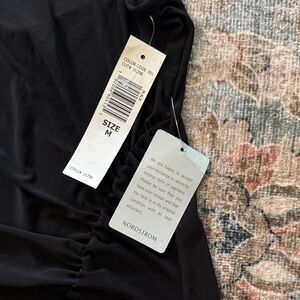 Chic black dress with a backless design. Features ruched detailing. Perfect for stylish outings.