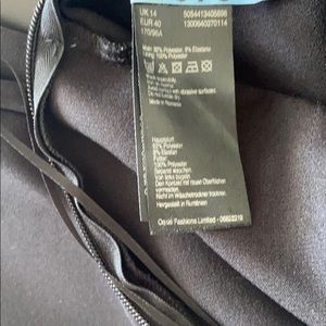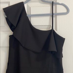 Black jump suit size 14 UK which would make it a size 10 to 12 US. One shoulder has a ruffle and a strap on other shoulder. Form fitted waste, wide leg and cropped length. Worn twice, but too small for me now ☹️. I purchased this from Oasis in London UK.