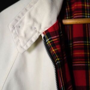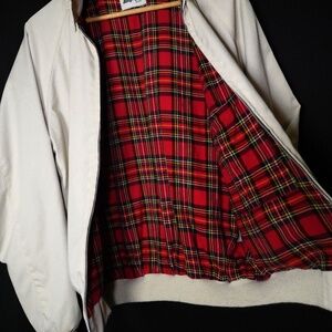 I'm selling my rare Jump the Gun Harrington jacket, made in the UK and worn only a couple times. If you’re familiar with the brand, you already know they specialize in classic British mod inspired styles. They're based out of Brighton. Their stuff doesn’t pop up often in the U.S., and this is one of their classic tartan-lined jackets in the stone colorway, with a vibrant red plaid interior; I actually had to get this directly imported. It's a similar style to Baracuta, or Ben Sherman.