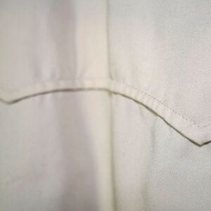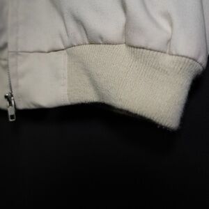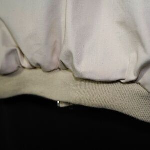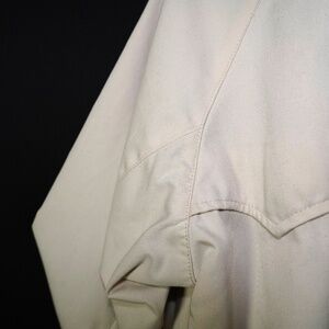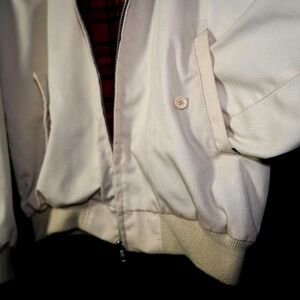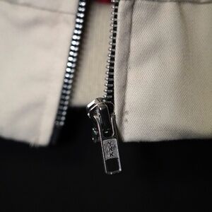 It’s tagged a 40 and fits like a men’s large with a regular silhouette, not super boxy, but not overly slim either. The outer shell is a heavy cotton that holds its shape well, and the inside is soft and breathable. You’ve got classic Harrington features: flap pockets, a full YKK zipper, a button tab collar, and ribbed cuffs and hem that give it a true 1960s vibe. Especially in this colorway, it's a bit hard to show on camera, but it's a very pale beige color, or an off white. Super classic.