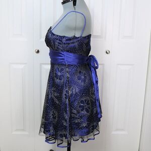 Spaghetti Strap Dress - NWOT, worn once, shown in second photo. Size 7/8 (listed as a size 7 Juniors). Fully lined, knee length. Mesh layer, silky satin layer, then another mesh layer on very bottom as shown that gives the dress it's bottom bit of texture. Color is a dark blue. Has sparkles/glitter all over it. Straps are non-adjustable as shown. Dress does zip all the way up, only pinned on plus size mannequin for photos. Is shown fully zipped on hanger photos. Measurements upon request.