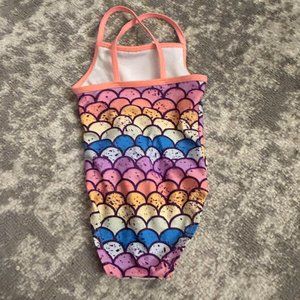 This listing is for a toddler girls' one-piece swimsuit. This swimsuit has a pattern of Fish scales. It is preowned in excellent condition. It comes from a smoke free home. All items are laundered prior to departing my home.