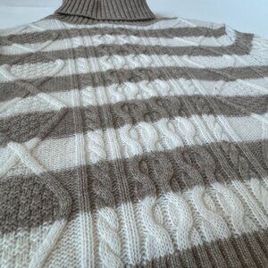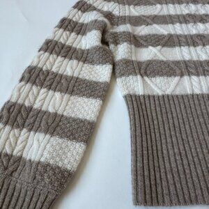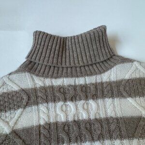 Good used condition. Pullover with high neck, cable knit and diamond knit patterns, stripes in a taupe brown and cream colorway. Long sleeves. Thanks for stopping by! Size 1, similar to a small. See measurements below for accuracy.