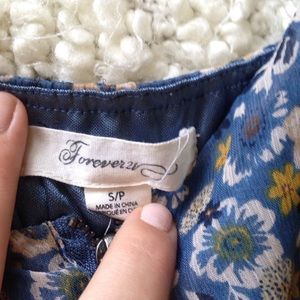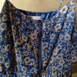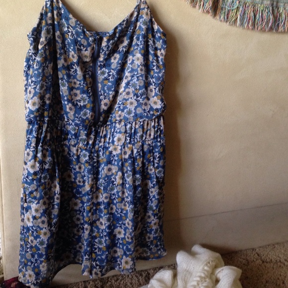 Light blue with small whit flowers all over, scrunch at your waist, built in shorts(jumper) adjustable straps, silk lining the inside.