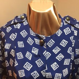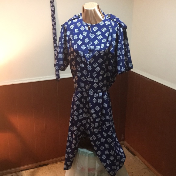 Ladies one piece jumper with brass buttons on shoulder and one brass button at the top. All other buttons are hidden. Matching belt included