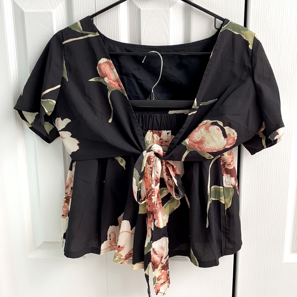 Crop top front tie and high waisted shorts. No tag but never have been worn. I am 5.4 125lbs and it fits perfect!