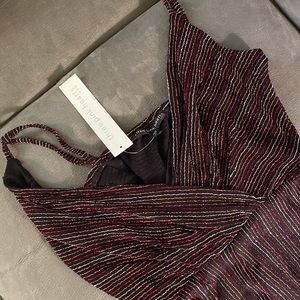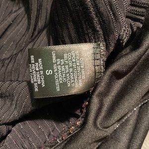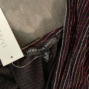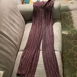 Beautiful long pants jumper. Spaghetti straps (adjustable), great stretchy material with glittery stripes. Black base w/ pinks, red, silver, gold. New with tag. Size small. $58 new, selling for $25. Non-smoking home with dog. Approximately 29” inseam. 24” empire waist.