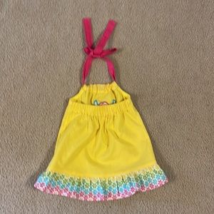 Yellow with flower ruffle, tie around the neck and has elastic back