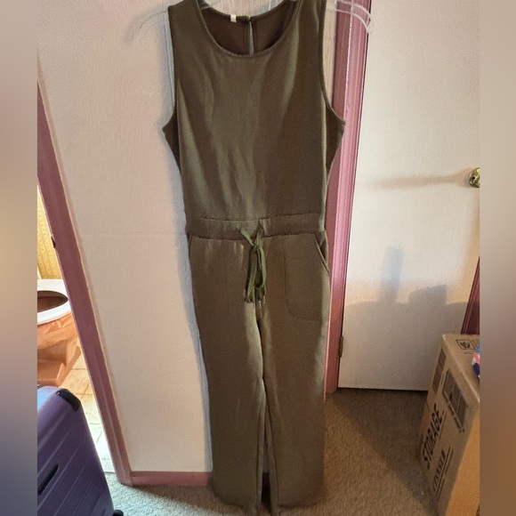 Navy green, nylon soft material jumpsuit. Buttons in the back. Says extra small but it’s definitely stretchy to fit a medium