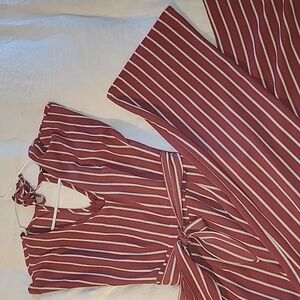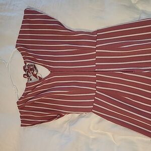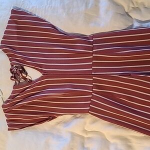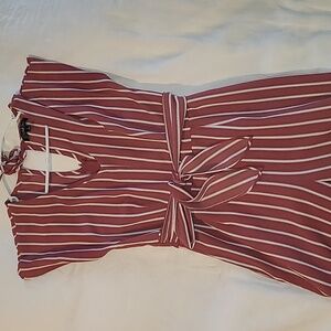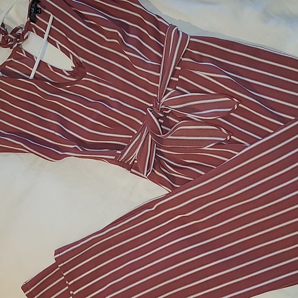 this beautiful rose colored jumpsuit comes with pockets, a tie for the front and tie at the neck, with small sleeve. Wether you are headed to the mall , lunch or out with friends this jumper is great for all occasions.