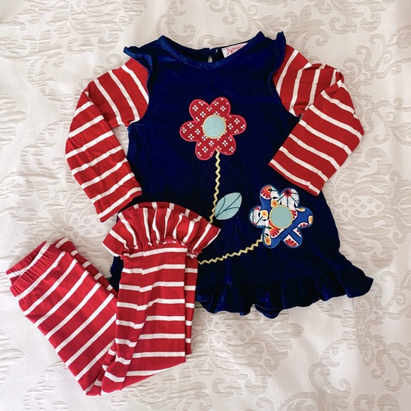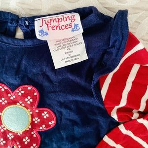 Great condition. Jumping Fences matching set with flower embellishments on top and striped, ruffled matching bottoms. Size 3T. Comes from smoke-free, lab friendly home.