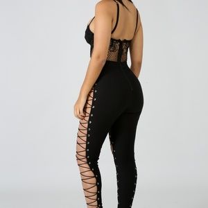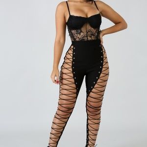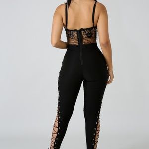 This lace corset jumpsuit features, a stretchy fabric, v-neckline, adjustable shoulder straps, well fitted, side leg corset tie, finished with a back zipper closure.